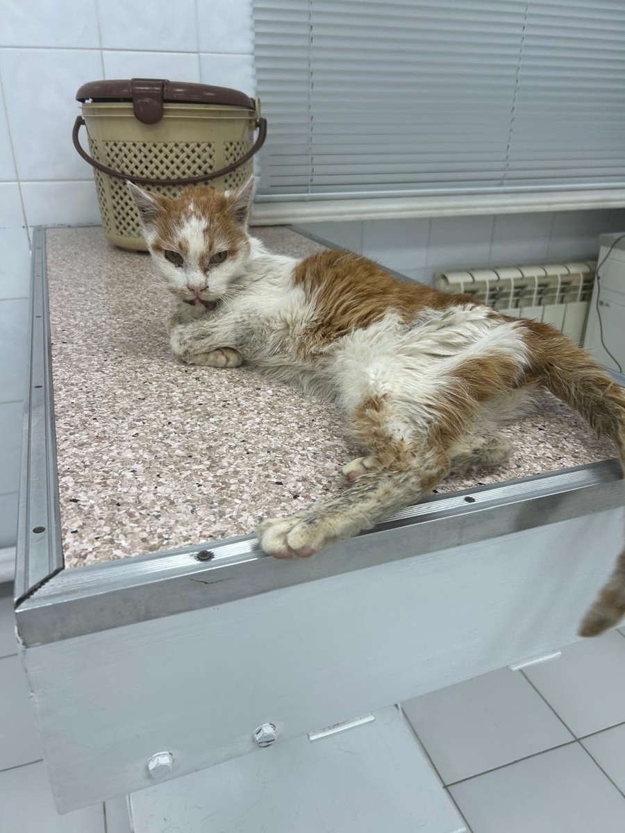 Она осторожно достала котика из контейнера и прижала к себе. Кот дрожал и тяжело дышал. Елена быстро позвонила нам, объяснила ситуацию и мы не могли не забрать котика в приют. Так Семён у нас и оказался. Мы немедленно записали Семёна на прием к врачу.