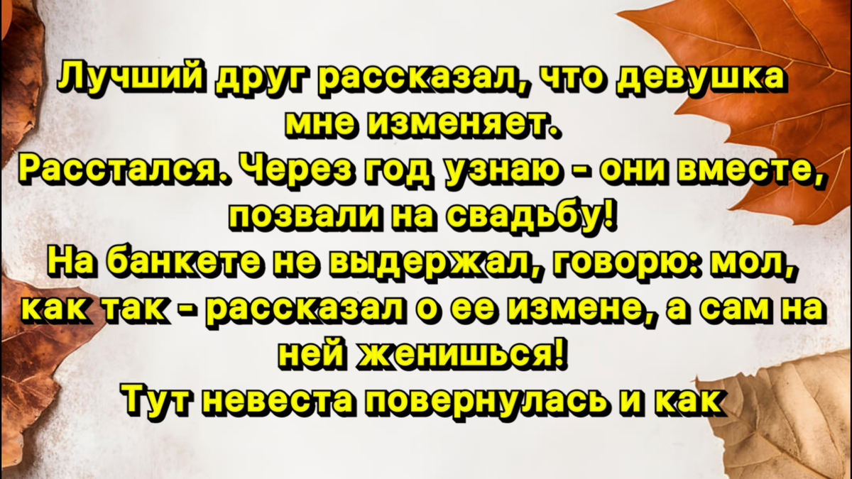 Лучший друг сказал, что моя девушка меняет. Я расстался. Через год они поженились и пригласили меня! На банкете я не выдержал. Друг признался, что солгал, чтобы самому быть с ней. На следующий день она подала на развод. Я потерял и девушку, и друга.