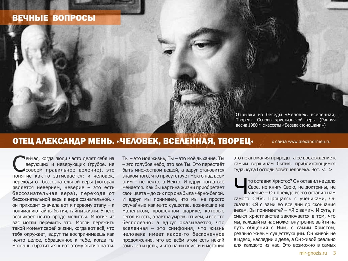 АЛЕКСАНДР МЕНЬ: «Самоотверженность, самоотверженный». А что это означает? И Христос сказал: Я вам заповедь даю новую (о любви говорили и раньше, многие века): любите друг друга, как Я возлюбил вас. Как Я. Самоотверженно. Ну, опять-таки, слово затаскано, мы употребляем «самоотверженность, самоотверженный». А что это означает? Это означает перестройку внутреннего нашего существа. Что у нас стоит на первом месте? Самость!! Я!! Эгоцентризм! В самом глубоком смысле этого слова. Вспомните, как вы беседовали с своими друзьями. Большинство из них разговаривали о чём угодно: о спорте, о книге, о кино, о личных делах, - почему-то автоматически переводят на свои дела разговор; и тогда только они как-то расцветают. Тут не надо людей винить, а просто – это у нас такой ствол - вот это «Я»! И христианство учит его преодолевать. Чтобы открылся настоящий источник личности, потому что это псевдо–личность. Эгоцентризм это карикатура на личность. Когда люди приходят к вере или находятся на первых её сту