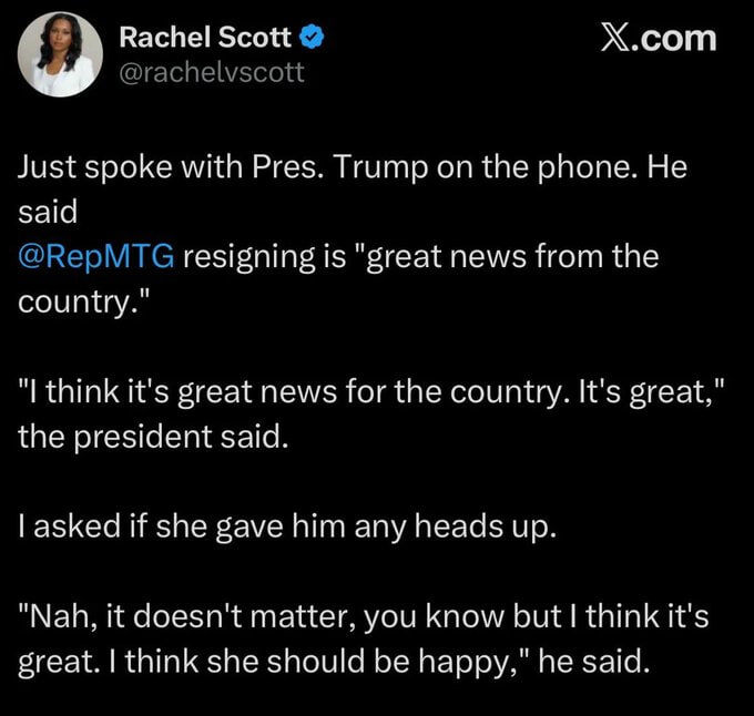 В ответ на пост Trump dubs MTG exit 'GREAT NEWS'