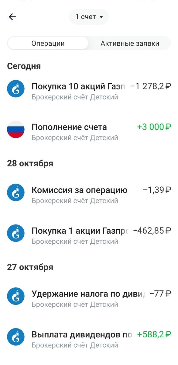 Сын ПЕРЕСТАЛ ВНОСИТЬ 50% на биржу. Он просто копит на свои компьютерные хотелки. Недавно накопил и купил игровую клавиатуру, которая обошлась, вроде, более 6000 руб. Но я продолжу пополнять традиционно его счёт по 3000 руб ежемесячно . Здесь покупки сегодня и ещё были дивиденды в октябре. Как видим, упор сделала на Газпром. Сейчас он в минусе в Детском портфеле. След пополнение в декабре.
