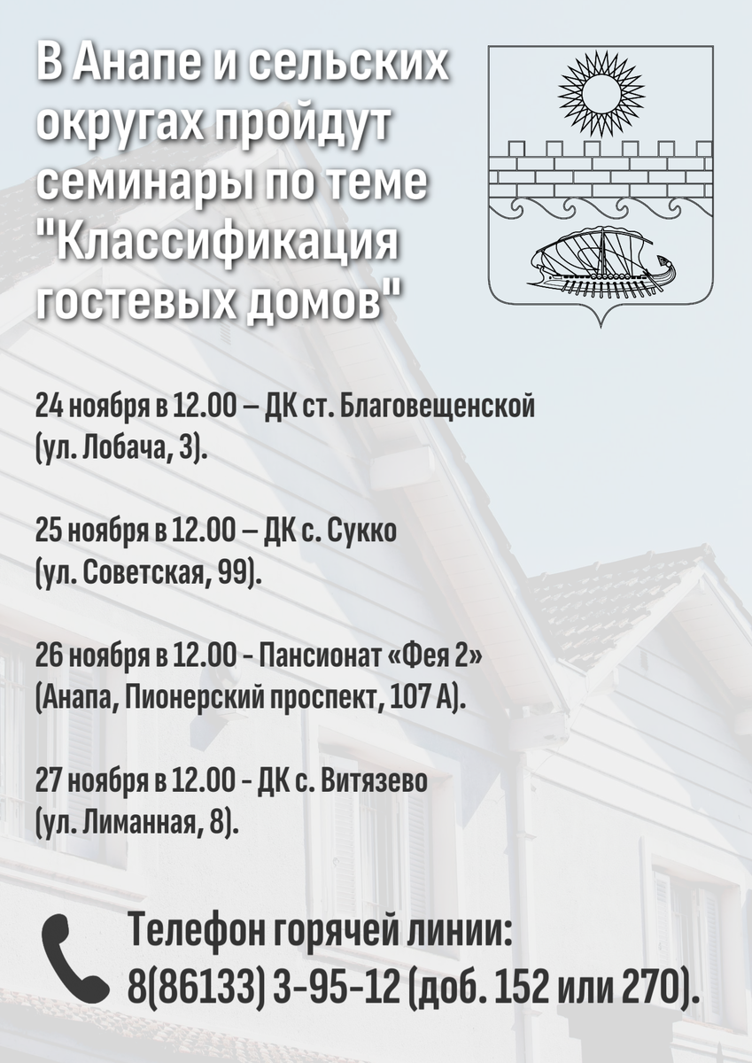 Специалисты управления курортов и туризма мэрии ответят на интересующие вопросы по теме классификации гостевых домов. Напомним, что с 1 января 2026 года оказывать услуги по предоставлению мест для временного проживания туристов без включения объекта в реестр и размещать объявления без указания присвоенного идентификационного номера противозаконно. 24 ноября в 12.00 – ДК ст. Благовещенской (ул. Лобача, 3). 25 ноября в 12.00 – ДК с. Сукко (ул. Советская, 99). 26 ноября в 12.00 - Пансионат «Фея 2» (Анапа, Пионерский проспект, 107 А). 27 ноября в 12.00 - ДК с. Витязево (ул. Лиманная, 8). Подробную информацию можно получить по телефону горячей линии: 8(86133) 3-95-12 (доб. 152 или 270).