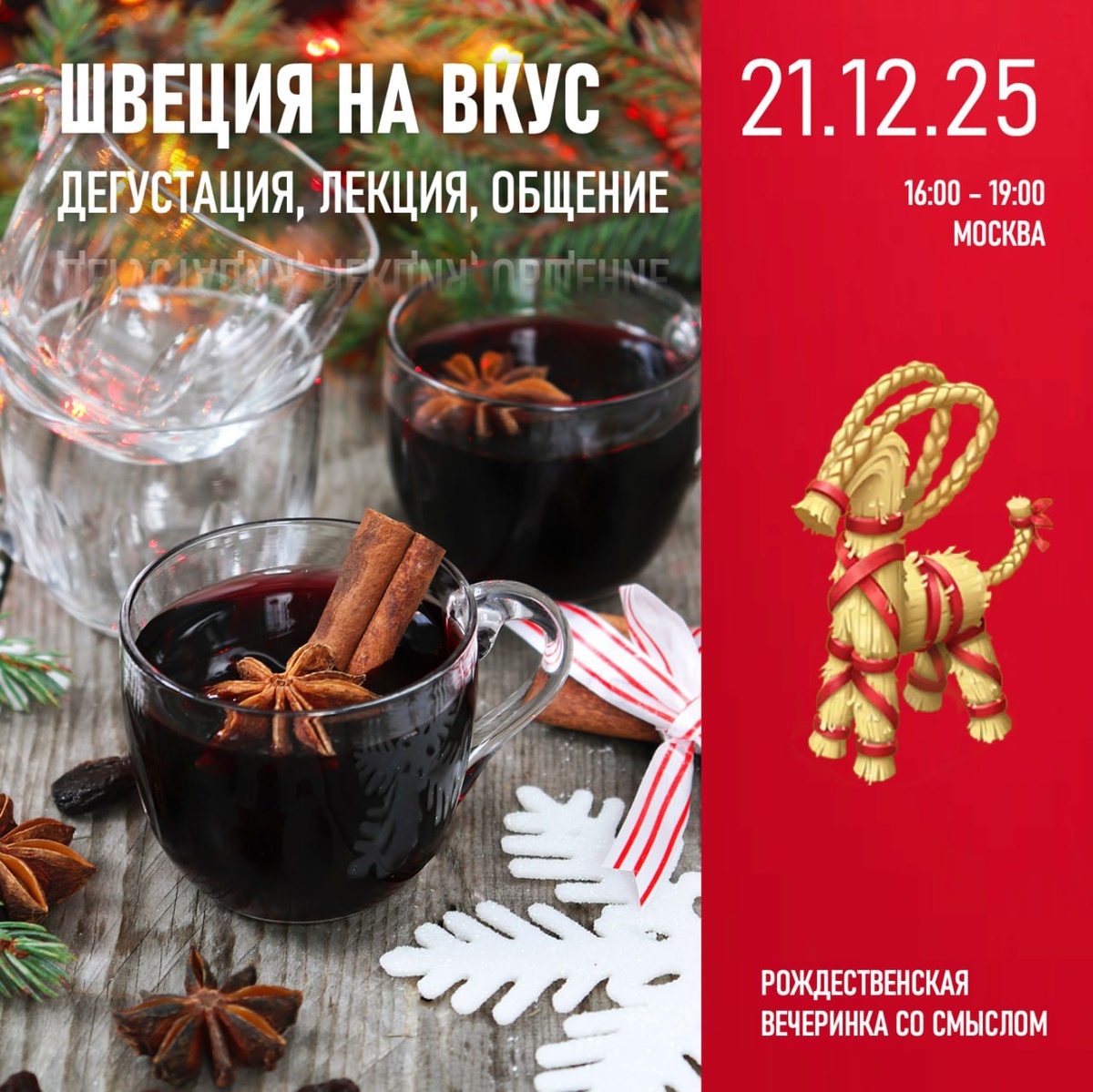 ❄️ШВЕЦИЯ НА ВКУС 🗓 Москва, 21 декабря 2025 года (воскресенье) ⏰ 16:00 – 19:00 Приглашаем на рождественскую вечеринку телеграм-канала Швеция и соседи, на которой вас ждет лекция про шведскую кухню, дегустация, глег, живое общение и хорошее настроение! На вечеринке вы сможете: - Попробовать традиционные шведские блюда и открыть для себя незнакомые вкусы - Насладиться ароматным глегом — согревающием пряным напитком - Узнать больше о шведской кухне и рождественских традициях - Узнать, что шведы едят по четвергам, пятницам и субботам - Открыть для себя рецепты шведских блюд и повторить их потом дома - Зарядиться рождественским настроением Итак, если вкратце: будет вкусно, сытно, атмосферно и интересно! До встречи! ⭐️Всего 30 мест. UPD: осталось 6 мест Подробнее