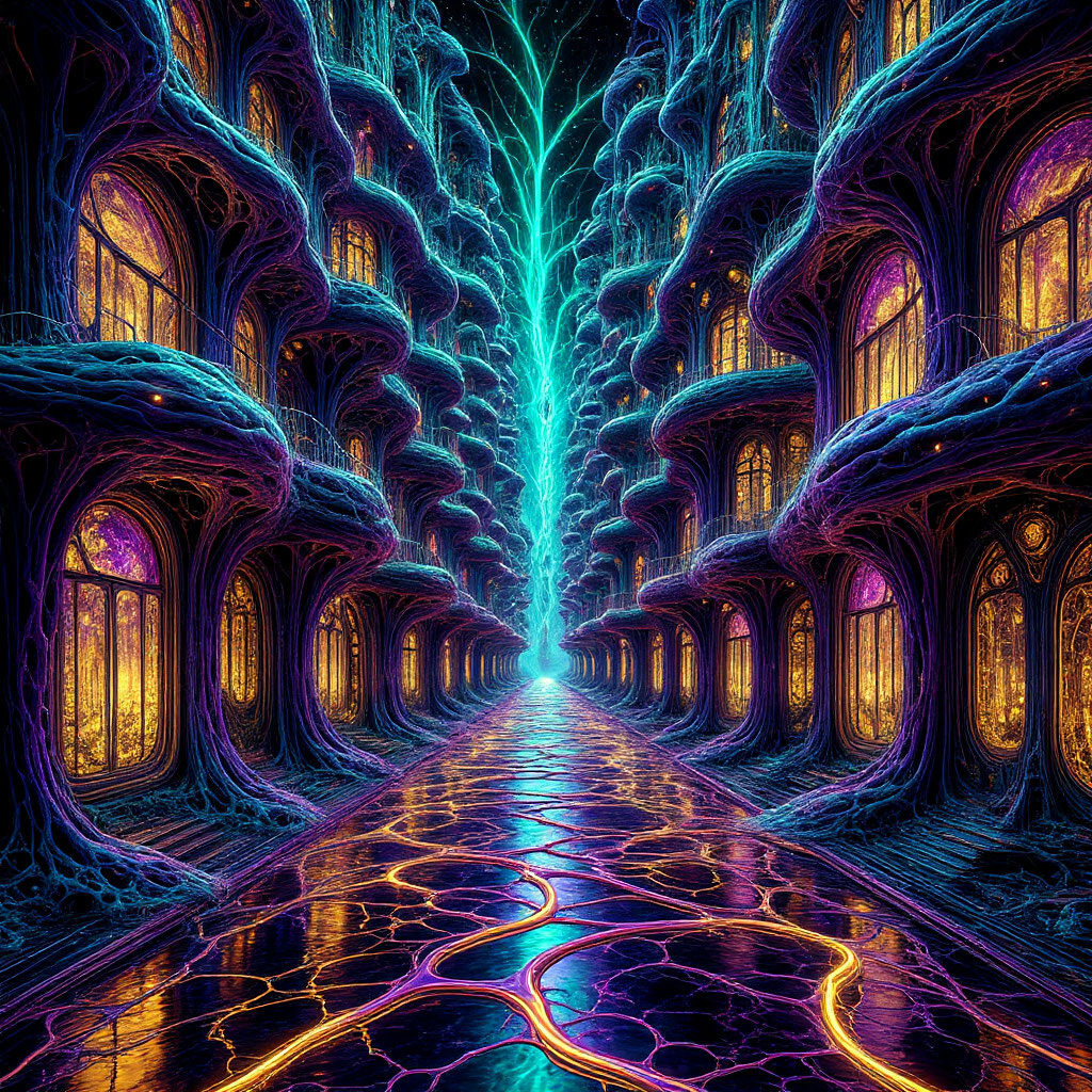 Это не город, а разум, обретший плоть. Гигантский, дышащий мозг, раскинувшийся под куполом беззвездного неба, где плывут облака, похожие на клубящиеся мысли. Я стою на перекрестке, который является синапсом — местом встречи и решения. Улицы-нейроны тянутся не вдаль, а вглубь, как жилки на опавшем листе вселенной. Они пульсируют ритмично, как сердце, передавая по своим жидкокристаллическим аксонам не сигналы света, а саму суть впечатлений. Под ногами не земля, а мягкая, пористая кора, испещренная капиллярами, по которым струится не кровь, а жидкая ностальгия. Воздух плотный, насыщенный озоном послегрозового озарения и сладковатым запахом миндаля — запахом рождающихся и умирающих воспоминаний. Каждое здание здесь — это глия, опорная клетка мироздания, сотканная из сгустков снов. Их стены — это не камень, а спрессованное время: в одних видны наслоения, как в геологических пластах, обнажающие детские страхи и юношеские восторги; другие прозрачны, как слеза, и за их плёнчатыми мембранами к