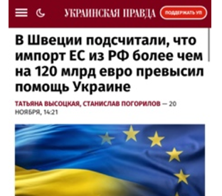 В Швеции не сдержались… вот кто их за язык тянул, когда на Украине до сих пор не разобрались: коррупция – это нормально, (как убеждал всех Мишка Ялтинский Подоляк) или в том, что на Украине вороватый каждый первый виноват Кремль? А тут ещё и шведы навалили. Цитирую боль Украинской Правды: «В Швеции подсчитали, что импорт ЕС из РФ более чем на 120 млрд евро превысил помощь Украине». То есть, ЕС перевел кровавому режиму на 124 млрд евро больше, чем защитникам мировой демократии! Так получается Европа спонсор войны?! Теперь украинцам надо наказать клятых эуропэйцев! Не берите их кровавые деньги! Пусть подавятся своими еврами! Гидность (достоинство) превыше всего! Или балаболы?