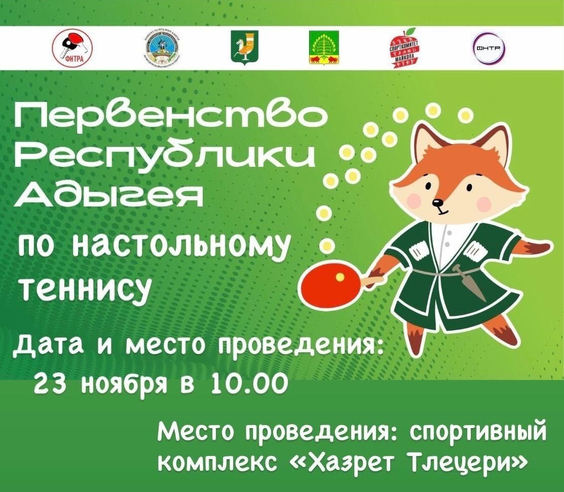 В Адыгейске пройдет первенство Республики Адыгея по настольному теннису среди юниоров и юниорок до 20 лет. Приглашаем всех любителей спорта на первенство Республики Адыгея по настольному теннису! Вас ждут динамичные матчи, высокие скорости и напряжённая борьба за звание сильнейших! Поддержите юных спортсменов и насладитесь зрелищными поединками! 23 ноября Спортивный комплекс "Хазрет Тлецери" Начало в 10:00ч.