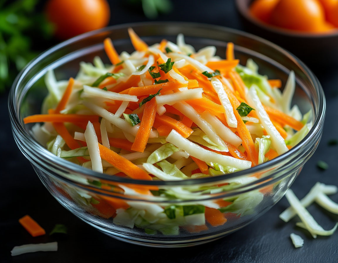 Этот салат из свежей капусты и моркови знаком каждому с детства. Он был неизменным атрибутом меню советских столовых и остается популярным до сих пор благодаря своей простоте, хрустящей текстуре и огромному количеству витаминов. Главный секрет того самого вкуса — это баланс соли, сахара и уксуса, а также правильная подготовка капусты. Приготовим классический вариант с подсолнечным маслом! Ингредиенты и их КБЖУ (на 2-3 порции) Пошаговый рецепт Время приготовления: 15 минут (плюс время на маринование) Шаг 1: Нарезка овощей Капусту тонко нашинкуйте (чем тоньше, тем лучше). Морковь натрите на крупной терке. Шаг 2: "Обмятие" капусты (Секрет столовой!) Переложите капусту и морковь в глубокую миску. Добавьте соль и сахар. Важно: теперь нужно тщательно перетереть овощи руками, как будто моете руки, пока капуста не пустит сок и не станет немного мягче. Это займет пару минут. Шаг 3: Заправка Добавьте уксус и подсолнечное масло. Хорошо перемешайте салат ложкой. Шаг 4: Настаивание и подача Перелож