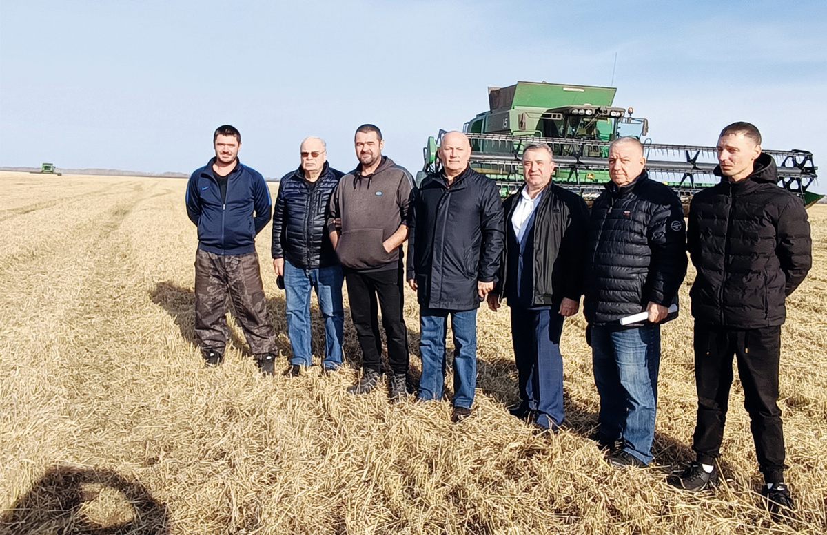 На поле площадью 432 га Виктор Кинсфатор показал Николаю Дрофе плотные, ровные валки пшеницы сорта «Елабуга». Колос отменный, налитой. Но много пшеницы полегло, пришлось применять стеблеподъемники, тем не менее урожайность на этом поле будет не меньше 50 ц/га. На другом поле два комбайна убирали пшеницу сорта «Калипсо», получили 58,8 ц/га, несмотря на то что сырость и снег на полях сдвинули уборку к концу октября.