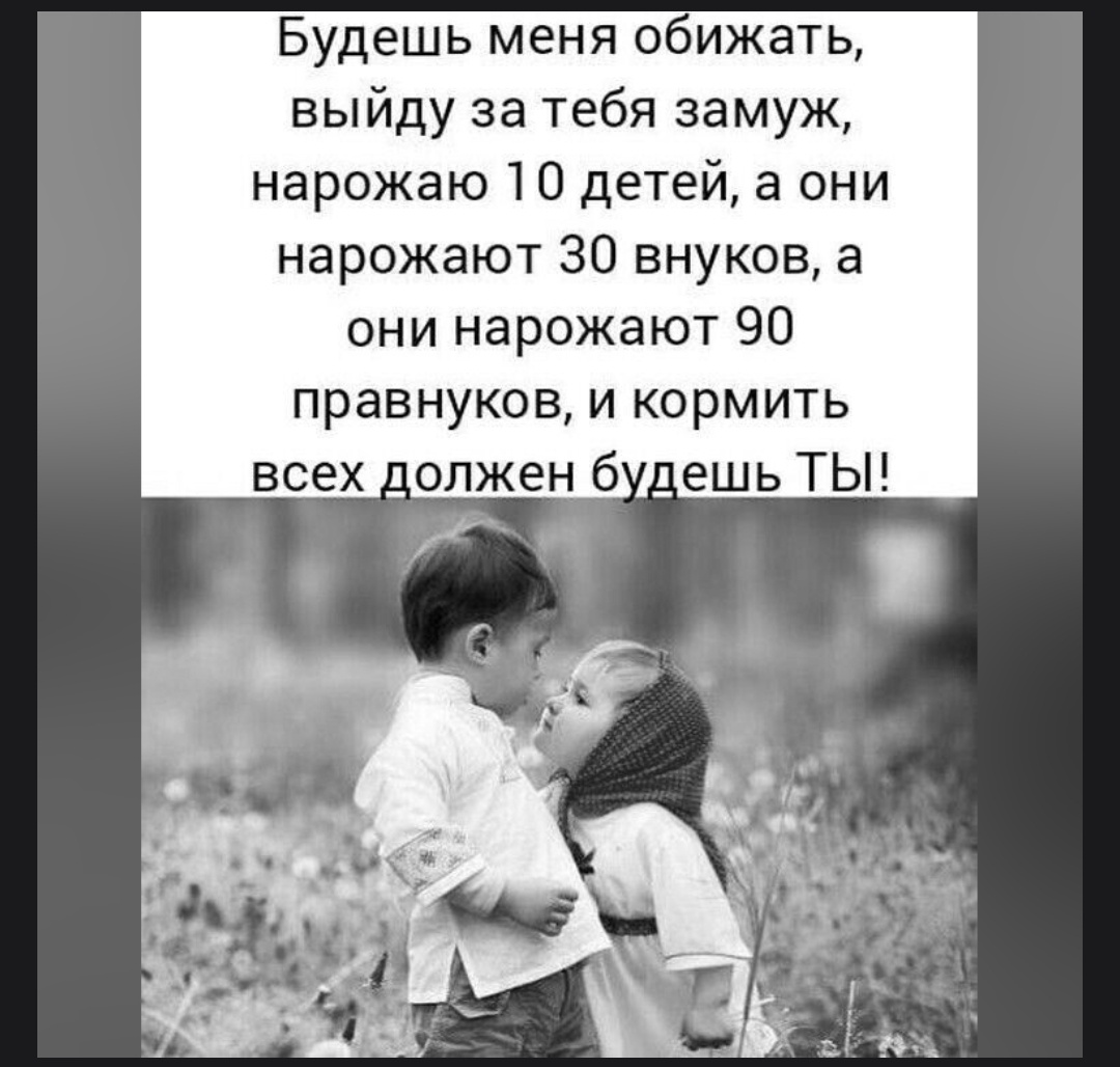 Про силу семьи и ответственность в отношениях Эта шутливая и в то же время серьёзная фраза отражает одно из важных жизненных наблюдений – последствия выбора партнёра и семейных отношений могут затронуть не только двух людей, но и их потомков на несколько поколений вперёд. Поколения и ответственность Когда речь идёт о семье и детях, ответственность одного человека постепенно распространяется на всю родственную цепочку. Если представить, что один человек решит создать семью, родить десять детей, которые в свою очередь создадут ещё больше потомков, то, в буквальном смысле, на плечах одного человека окажется забота о большом количестве людей – не только эмоциональная, но и материальная. Важность уважения в отношениях Фраза подчёркивает, как важно уважать и ценить друг друга в паре, ведь обиды могут привести к серьёзным последствиям не только сейчас, но и в будущем. Содержание семьи — это общий труд, и чем больше потомков, тем значительнее эта ответственность. Итог - Семейные отнош