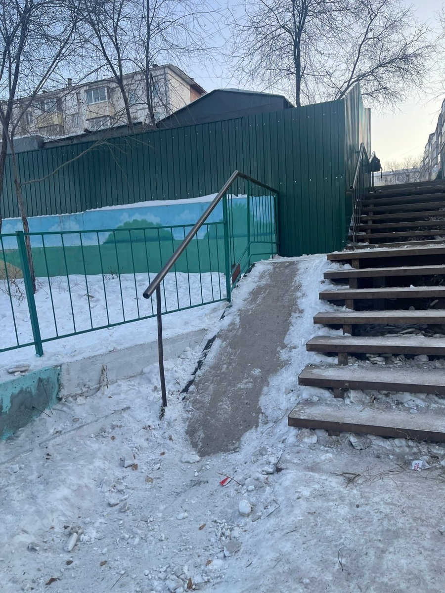 Перекрыли пандус, сместили перила, заузив лестничный марш и тд. Проспект Строителей дом 14