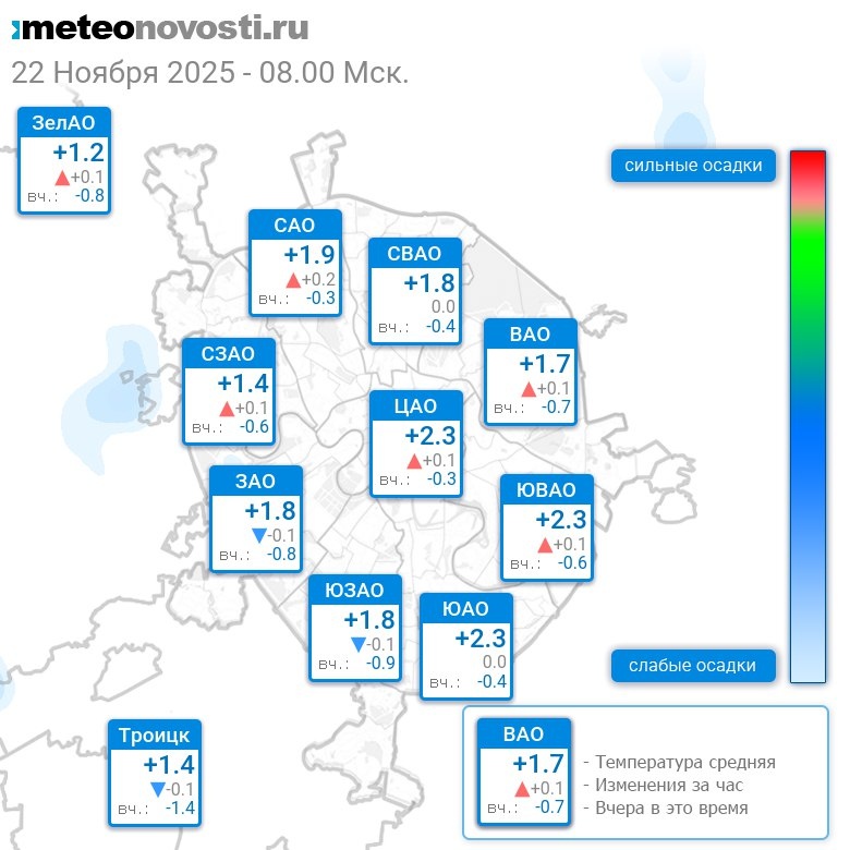 В 8:00 в Москве было от +0.7°C до +2.8°C, средняя температура +1.9°C #погода #Москва #осень #температура #22ноября #суббота