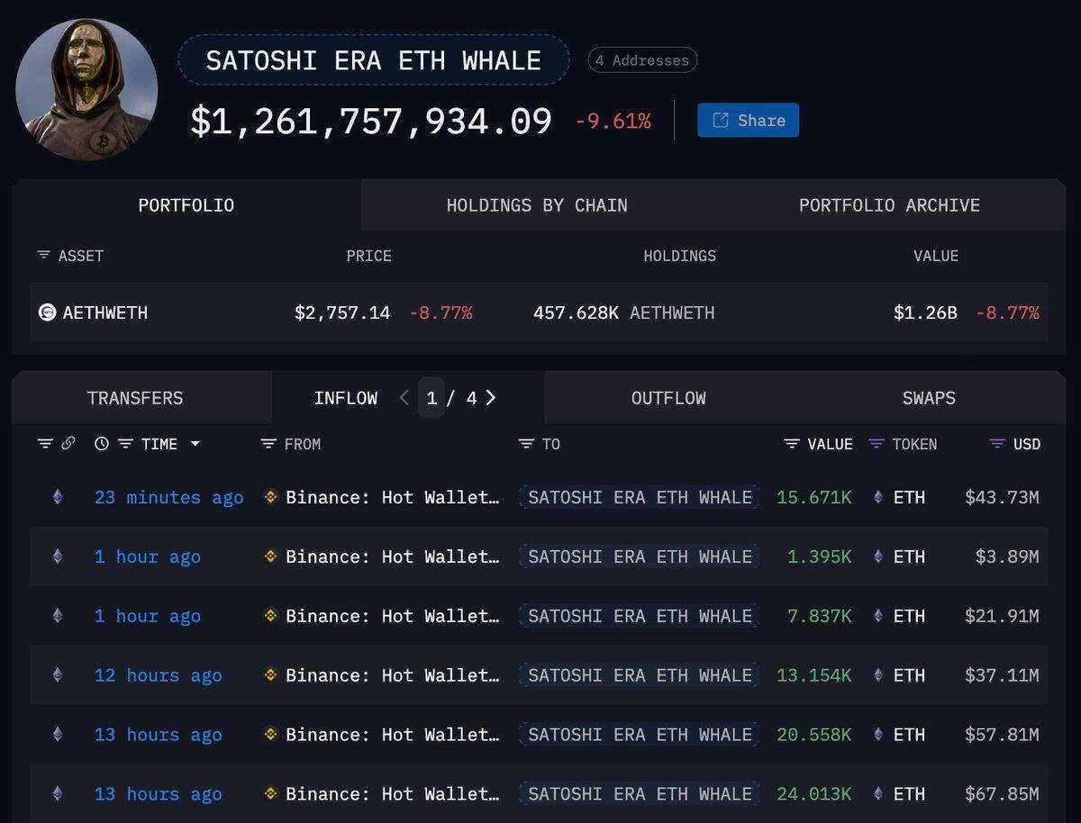 π ΠΡΠΈΠΏΡΠΎΠ°ΠΊΡΠΈΠ²Π½ΡΠ΅ ΠΈΠ³ΡΠΎΠΊΠΈ ΠΏΡΠΎΠ΄ΠΎΠ»ΠΆΠ°ΡΡ ΡΠ΄ΠΈΠ²Π»ΡΡΡ: Satoshi Era Whale ΠΏΡΠΈΠΎΠ±ΡΠ΅Π» 457 000 ETH Π½Π° ΡΡΠΌΠΌΡ $1,25 ΠΌΠΈΠ»Π»ΠΈΠ°ΡΠ΄Π°. π ΠΡΠΎΡ ΠΊΠΎΡΠ΅Π»Π΅ΠΊ, ΠΊΠ°ΠΊ ΠΈΠ·Π²Π΅ΡΡΠ½ΠΎ, ΠΈΠ΄Π΅Π°Π»ΡΠ½ΠΎ ΠΎΠΏΡΠ΅Π΄Π΅Π»ΡΠ΅Ρ ΠΊΠ°ΠΆΠ΄ΠΎΠ΅ ΠΏΠ°Π΄Π΅Π½ΠΈΠ΅ ΡΠ΅Π½ ΠΈ Π²ΡΠ΅Π³Π΄Π° ΠΈΠ΄Π΅Ρ Β«Π² ΠΏΠΎΠ»Π½ΡΠΉ Π²Ρ