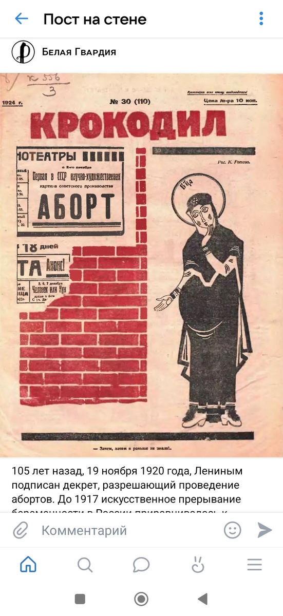 Ещё один симптоматичный пример левой инверсии(*): попытка придать положительную коннотацию (забота о трудящихся массах) решению большевиков легализовать аборты (по сути - легализовать убийства "в дополнение" к красному террору). Правда, на мой вопрос о причинах отмены большевиками уголовного наказания за мужеложство - ответа пока не последовало. Интересно, какими "благими" побуждениями, с точки зрения тов. Кажиховой, руководствовались большевики отменяя уголовное наказание за мужеложство? Вера-Юрьевна Кажихова, Продолжается демонизация советской власти, производится семантическая подмена. Все было не так. Легализовали аборты в Советской России в 1920 году. Правительство приняло такое решение в рамках тенденции по расширению прав женщин и из-за изменений в медицинской этике, в которой произошёл отход от религиозных представлений о беременности. Кроме того, легализацию объясняли необходимостью прекратить общемировую практику преследования абортов, так как это приводило к тому, что же