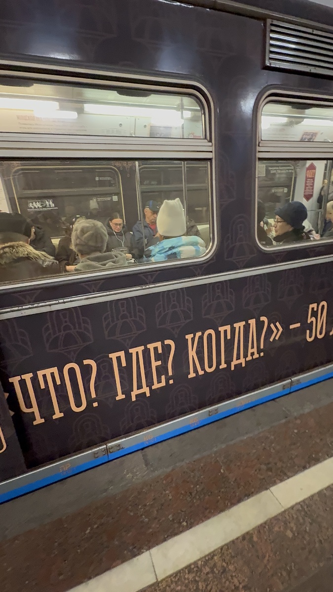 Самый удобный способ передвигаться по Москве-метро. С его помощью огромные расстояния преодолеваются от нескольких минут до одного часа. И в этот раз я не стала отказываться от этого транспорта. Когда подошёл состав, стало ясно, что это не обычный поезд. Вся внешняя обшивка в фирменных цветах «Что? Где? Когда?», с крупными элементами оформления и узнаваемыми символами игры. Внутри тематика продолжается. И уже через минуту увидела перед собой «ВНИМАНИЕ, ВОПРОС!» и текст, который сначала казался набором странностей: «Дуб горяч около крысы», «Ребёнка глаз пошёл красным», «Парк прохладный для чтения», «Толкай короля, небо есть». Фразы выглядели полностью лишёнными смысла. Стало понятно, что в них что-то спрятано. Ответ будет в конце статьи, вместе с фотографией. На красной линии курсирует целый состав, посвящённый 50-летию игры. Каждая зона в вагоне работает как небольшая выставка: история проекта, имена знатоков, редкие кадры, факты из разных сезонов. Информация размещена так, что