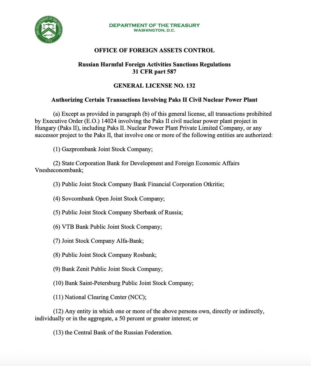 Минфин США опубликовал лицензию, разрешающую транзакции с рядом российских банков в рамках проекта АЭС "Пакш-2" в Венгрии Ранее об этом в т.ч. договорился Орбан