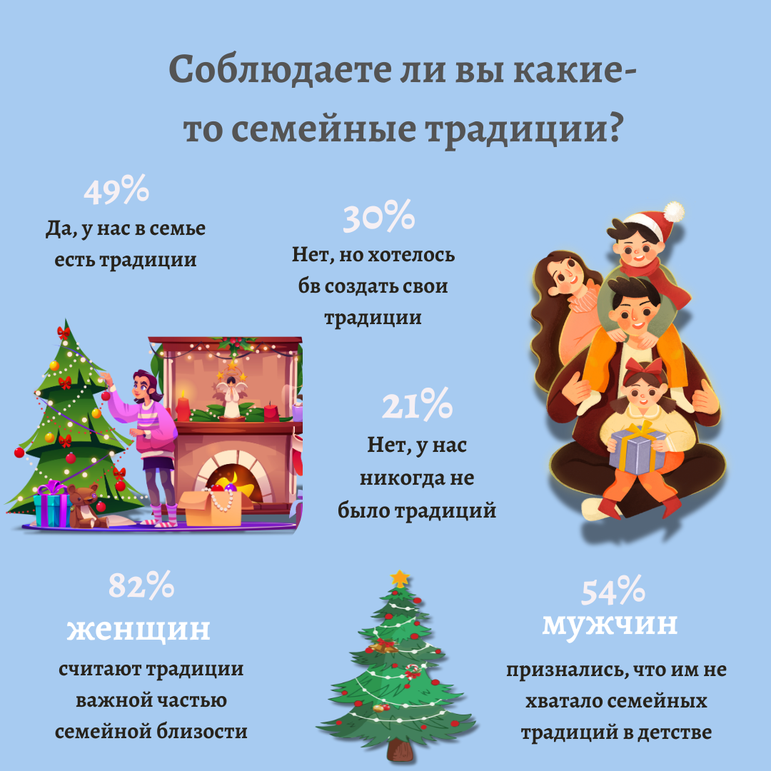 Приближаются рождественские и новогодние праздники, самое время поговорить о традициях! Мы опросили 27 600 наших пользователей в возрасте от 24 до 75+ лет из разных уголков мира на тему семейных традиций. 49% респондентов отметили, что у них в семье были и есть традиции, которые они соблюдают. 30% - указали, что никаких традиций нет, но они очень хотели бы создать свои собственные. 21% опрошенных - нет, не было и нет традиций. 82% женщин считают традиции важной частью семейной близости. 💖 А 54% мужчин признались, что им не хватало семейных традиций в детстве. Традиции - это не про строгость и правила. Это про моменты, которые объединяют. И даже одна маленькая привычка, повторяющаяся из года в год, уже может стать вашей семейной историей. Например, вместе наряжать елку или выбирать подарки, раз в месяц выбираться всей семьей на ужин или играть в настольные игры по вечерам в выходные. 😍 А для вас важны традиции? Соблюдаете какие-либо из них? Скорее делитесь в комментариях! ❣ Проходите