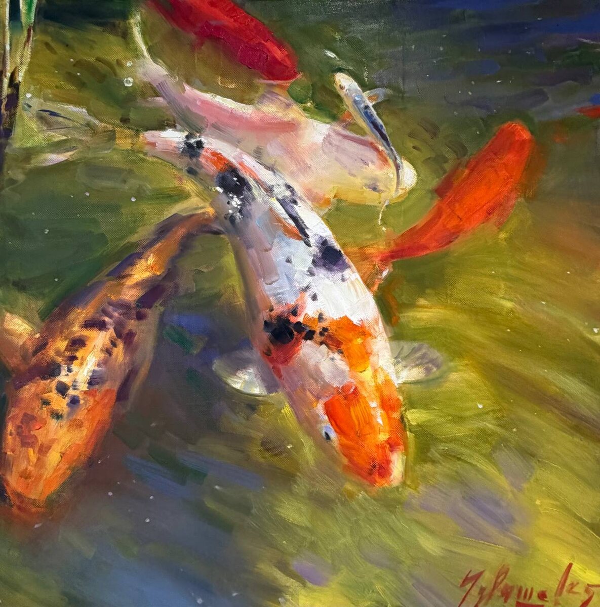 Вчера в галерею YOLKA art заплыли карпы кои. Надо ли говорить, что помимо удачи, благосостояния и успеха в бизнесе (по мнению китайцев и даже некоторых японцев), они приносят в дом яркие впечатления и нескончаемую радость. Размер прекрасный - 100х100 P.S. кто отгадает художника, тому бесконечный респект от галереи.