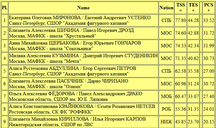 Далеко впереди Катя Миронова/Евгений Устенко (77.80 - 1 место). Судя по баллам, они уверенно движутся не только к победе на этом турнире, но и к бронзе на будущем Чемпионате России, который пройдет в их родном Санкт-Петербурге.
