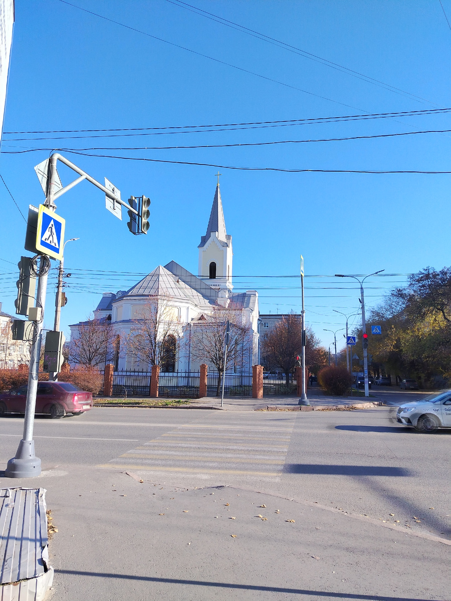 Прогуливаясь по центру города, я случайно увидела красивый храм. Меня немного смутил купол и крест. Ведь в православных церквях купола более округлые и в основном золотые. Крест у нас шестиконечный. В общем, я решила зайти внутрь. Интересный стиль. Над главным входом — башня в готическом стиле с колокольной звонницей, увенчанная шпилем. На территории храма есть скульптура Девы Марии с младенцем. В храм не зашла. Не моя вера. Я не совсем понимаю, экскурсии для православных в мечети. Считаю, что это оскорбление религий. И по отношению к мусульманам. И мы, как православные, по моему мнению, должны посещать только наши святые места. Я не предполагала, что в Волгограде есть католический храм, да, честно говоря, даже не знаю, задумывалась, какие храмы, мечети и прочие места для молитв разных религий у нас есть. Но оказалось, что у этого храма длинная и интересная история. Первыми католиками на территории современной Волгоградской области были поволжские немцы, которые появились здесь в к