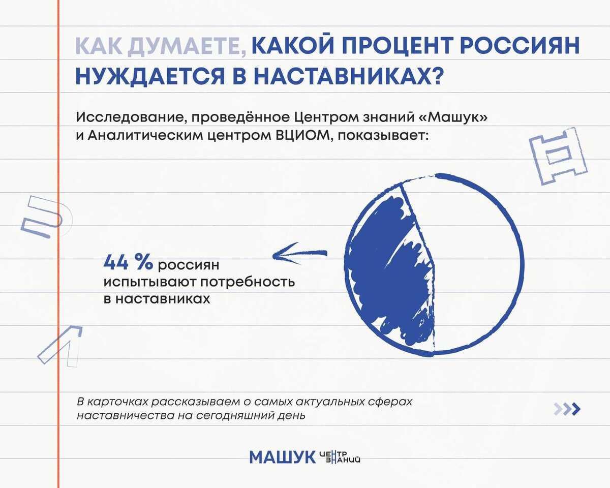 Готовы узнать интересные цифры о наставничестве в России? 🧐 Сегодня делимся данными исследования Центра знаний «Машук» и Аналитического центра ВЦИОМ. Они будут полезны тем, кто хочет стать наставником и помогать другим, но не понимает, в какую сферу податься. ✏️ В исследовании – самые актуальные данные, которые помогут определиться и глубже изучить вопрос наставничества в нашей стране. Какой факт стал для вас особенно неожиданным? Расскажете в комментариях? 👇