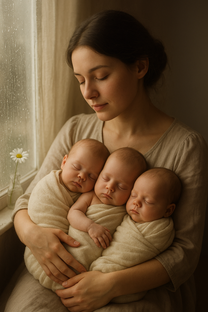 Алина смотрела в окно. За окном шёл дождь, тихий и упорный, как время. Она прижала к себе троих, ещё тёплых, пахнущих молоком и жизнью, и шептала, как молитву: