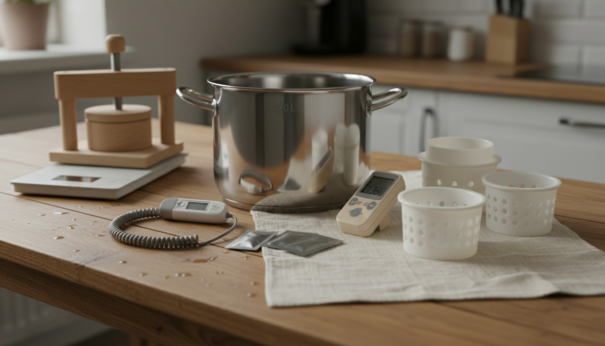 - Оборудование (дачная версия): нержавеющий котёл 10–20 л; цифровой термометр с длинным щупом; pH‑метр или индикаторные полоски; шумовка и ложка; нож для сгустка; марля/муслин; формы и пресс; бытовые весы; контейнеры для рассола; термометр/гигрометр для комнаты выдержки.