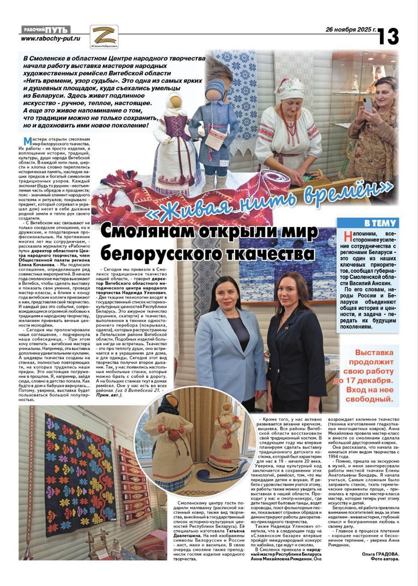 📰Смоленский центр народного творчества в смоленских СМИ! Делимся с вами материалами и ссылками на свежие статьи о мероприятиях нашего Центра: "Смолянам открыли мир белорусского ткачества" - Рабочий путь ⬇️ www.rabochy-put.ru/society/20... "Мост дружбы и взаимопонимания: В Смоленске прошёл фестиваль «Неделя национальных культур»" - MK RU Смоленск www.mk-smolensk.ru/culture/20... #СОЦНТ_СМИ