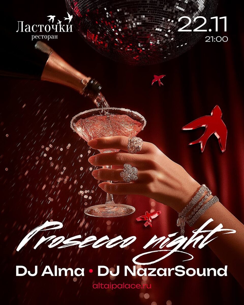22 ноября — Prosecco night в Altai Palace🍸 Волшебная суббота под бокалы игристого продолжается на курорте Altai Palace ✨ В эту ночь за диджейским пультом гостей ждет DJ Alma и DJ NazarSound 🎵 Насладитесь этим вечером вместе с нами в Altai Palace ❤️ ▫️ 22 ноября ▫️ 21:00 ▫️ Ресторан «Ласточки» ▫️ Бронь столов: 8-914-059-88-16
