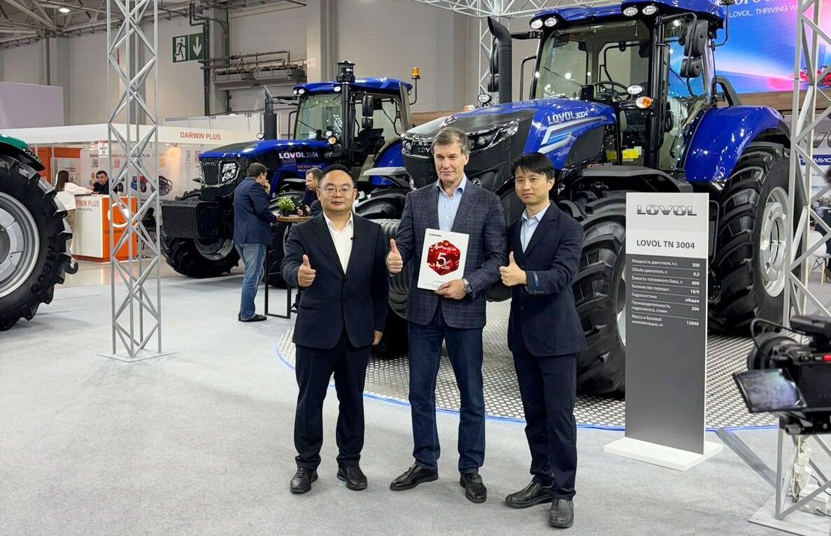 Ли Вей, директор российского рынка Lovol, и Джан Синьсин, региональный менеджер, вручили генеральному директору нашей компании Сергею Леонидовичу Суховенко юбилейный диплом «Lovol и Бизон Юг – 5 лет сотрудничества». Поздравление состоялось на совместной экспозиции поставщика и дилера на выставке «ЮгАгро» в Краснодаре. Компания «Бизон» сотрудничает с Weichai Lovol с 2021 года и является дилером по продаже тракторов в ЮФО, СКФО, Запорожской и Херсонской областях, ДНР и ЛНР. Ежегодно предприятие показывает высокую динамику продаж техники и высокий уровень её обслуживания. Так, в 2024 году компания была признана Lovol лучшим поставщиком услуг сервиса в России, а в 2025 году – лучшим дилером и лучшей командой продаж в России.