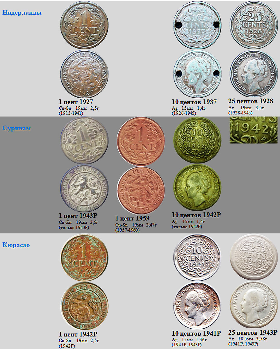 Во время Второй Мировой Войны (1939-1945) в монетах Нидерландов не обошлось без лёгкого хаоса. Малышку 1 цент перестали чеканить на территории Нидерландов в 1941 году. Однако такую монету с более поздними датами можно легко обнаружить. Монетный двор Нидерландов продолжил выпуск монетки 1 цент для своих колоний. В 1942 отчеканена партия для Кюрасао. Она отличалась от предшественниц буквой «Р», которая находилась под последней цифрой даты, слегка завалившись на бок. А специально для Суринама выпустили 1 цент 1943Р. А когда возникла необходимость еще пополнить запас мелких монет в Суринаме, то отчеканили 1 цент с датами от 1957 до 1960. Только уже без всякой буквы «Р». Не совсем такая же, но схожая ситуация была с монетами 10 и 25 центов. Их продолжали пока еще выпускать для нужд Нидерландов. А для колоний выпустили (опять с буквой «Р») для Суринама 10 центов 1942Р. А для Кюрасао 10 центов 1941Р и 1943Р. И монету 25 центов тоже 1941Р и 1943Р. Все это звучит достаточно путано. Но вполне