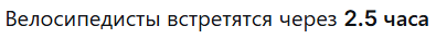 Из двух пунктов A и B, расстояние между которыми равно 70 км, навстречу друг другу одновременно выехали два велосипедиста. Через сколько часов велосипедисты встретятся, если их скорости равны 12 км/ч и 16 км/ч? Когда два объекта движутся навстречу друг другу, их скорости складываются. Скорость сближения велосипедистов: 𝑣=12+16=28 км/ч. Время до встречи находится по формуле: t=s/𝑣, где s — начальное расстояние. t=70/28=2.5 часа. Пусть t — время в пути до встречи (в часах). Первый велосипедист проедет до встречи: 12⋅t км. Второй велосипедист проедет до встречи: 16⋅t км. Вместе они проедут все расстояние: 12t+16t=70. Решаем уравнение: 28t=70. t=70/28=2.5 часа.