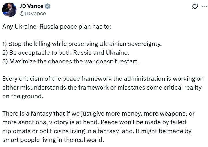 ԱՄՆ փոխնախագահը հրապարակել Է Ուկրաինայի հարցով խաղաղության ծրագրի գլխավոր սկզբունքները Վենսը կարծում է, որ Ուկրաինայի և Ռուսաստանի միջև ցանկացած խաղաղության ծրագիր պետք է. դադարեցնի սպանությունները՝ պահպանելով Ուկրաինայի ինքնիշխանությունը։ Ընդունելի լինի և՛ Ռուսաստանի, և՛ Ուկրաինայի համար։ Նվազագույնի հասցնի պատերազմի վերսկսման հավանականությունը։