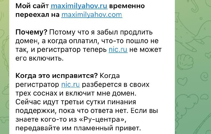 Пост для тех, кто до сих пор не съехал с nic.ru на beget В копилку к долгому ответу от ТП, дороговизне и впаривание ненужных услуг добавляется проблема с активацией домена. Если нужна помощь с переездом на beget, пишите 👉 @vadimfominov