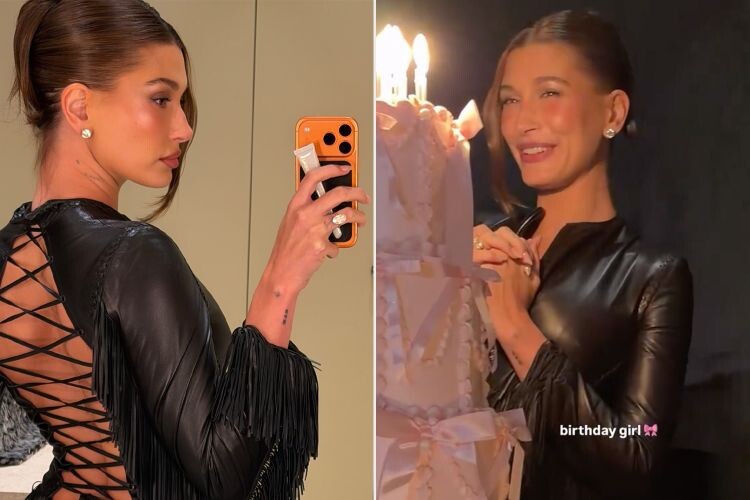 Хейли выбрала спокойный, камерный формат праздника. Это был тот редкий вечер, когда всё выглядит по-настоящему: мягкий свет свечей, тихие голоса друзей, нежный розовый торт с тонкими бантиками и нежным кремовым рисунком. Пять ярусов создавали эффект сладкой архитектуры и наполняли пространство лёгкой, почти сказочной женственностью. Её образ держался на выразительном контрасте. Чёрный кожаный топ с открытой спиной и длинной бахромой, прямые чёрные брюки, аккуратные бриллиантовые серьги и обручальное кольцо. В зеркальном отражении — фирменный чехол Rhode, который давно стал частью её модного почерка. Праздник получился тёплым и очень личным, словно мягкая пауза среди насыщенного ноября, в котором она уже успела поздравить Кендалл Дженнер с 30-летием и побывать на большом юбилее Крис Дженнер. А вам нравится такой формат дня рождения, где строгий чёрный образ соседствует с розовым тортом в несколько ярусов?