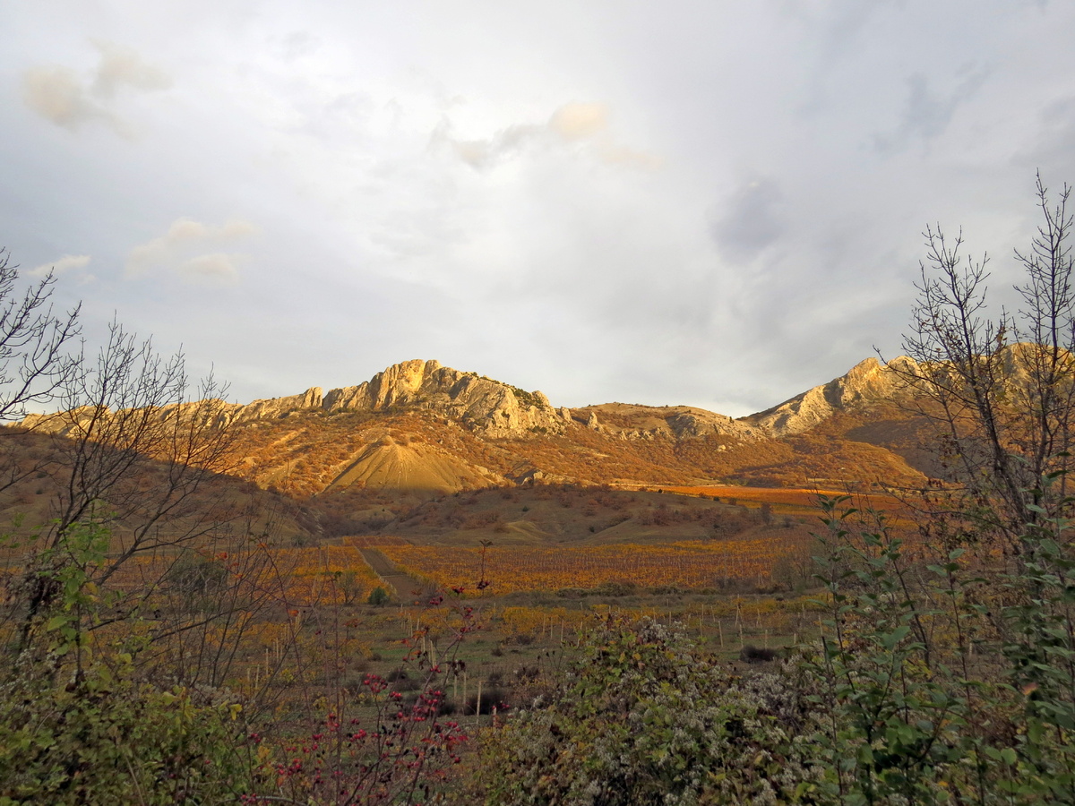 Утро 18 ноября началось из заезда в Орджоникидзе за Виктором. Мы втроем решили отправится к Чертовым Рожкам или Чатал-Кая, которые возвышаются над поселком Веселое. Конечно же, можно на них подняться и со стороны трассы, но нам больше нравится этот подъем со стороны села Междуречье. А пока мы едем по утренней дороге. За окном то и дело мелькают то виноградники, то утренние горы. Я и Виктор со вздохом провожаем взглядом каждый не попавший в объектив красивый миг. Но, проехать мимо утреннего Таракташа уже невозможно. "Миша! Стой!" Солнечный луч скользнул по вершинам скал, освещая и окрашивая в мягкий цвет. Тень горы, что у нас за спиной прикрывает виноградники. Но это не мешает медленно стекать золоту по склонам хребта и растекаться по виноградному полю. Как же красиво! Золотое утро! А ведь виноградники под этим хребтом, начали высаживать с незапамятных времен! Случайно попалась на глаза Гравюра Гейслера К. Г. Г. "Таракташ"из книги П. С. Палласа, 1794 года!!! Изображение цепи ут