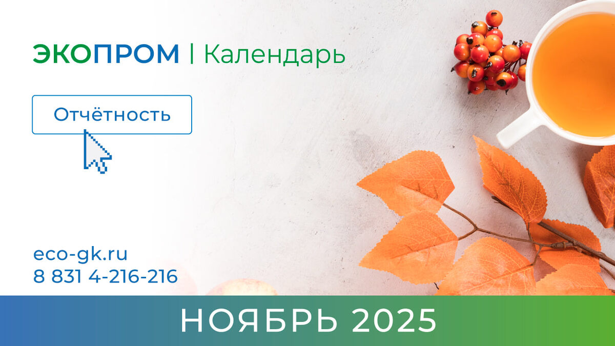 ЭКОПРОМ | Календарь 📆 1 ноября ➡️ Декларация о составе и свойствах сточных вод для абонентов ЦСВ, если среднесуточный объем отводимых сточных вод составляет более 30 куб.м./сут. суммарно по всем выпускам 📆 До 31 ноября ➡️ Сформируйте сводные данные по отходам, выбросам и сбросам за 11 месяцев — для подготовки годовой формы 2-ТП (отходы, воздух, водхоз) ➡️ Проверьте корректность ведения журналов учёта образования отходов ➡️ Проведите ревизию лимитов и договоров на транспортировку, обработку, утилизацию, обезвреживание и размещение отходов ➡️ Уточните сведения о выполняемых замерах в рамках производственного экологического контроля (ПЭК) 📑 ЗАКАЗАТЬ ОТЧЕТНОСТЬ (https://eco-gk.ru/ekologicheskaya-otchyotnost/?utm_source=telegram) 📎 Важно: перечень отчетности и сроки могут отличаться в зависимости от категории НВОС, отрасли и региона деятельности предприятия. Рекомендуем экологам уточнять актуальные формы и даты в соответствии с требованиями Росприроднадзора и региональных органов надзо