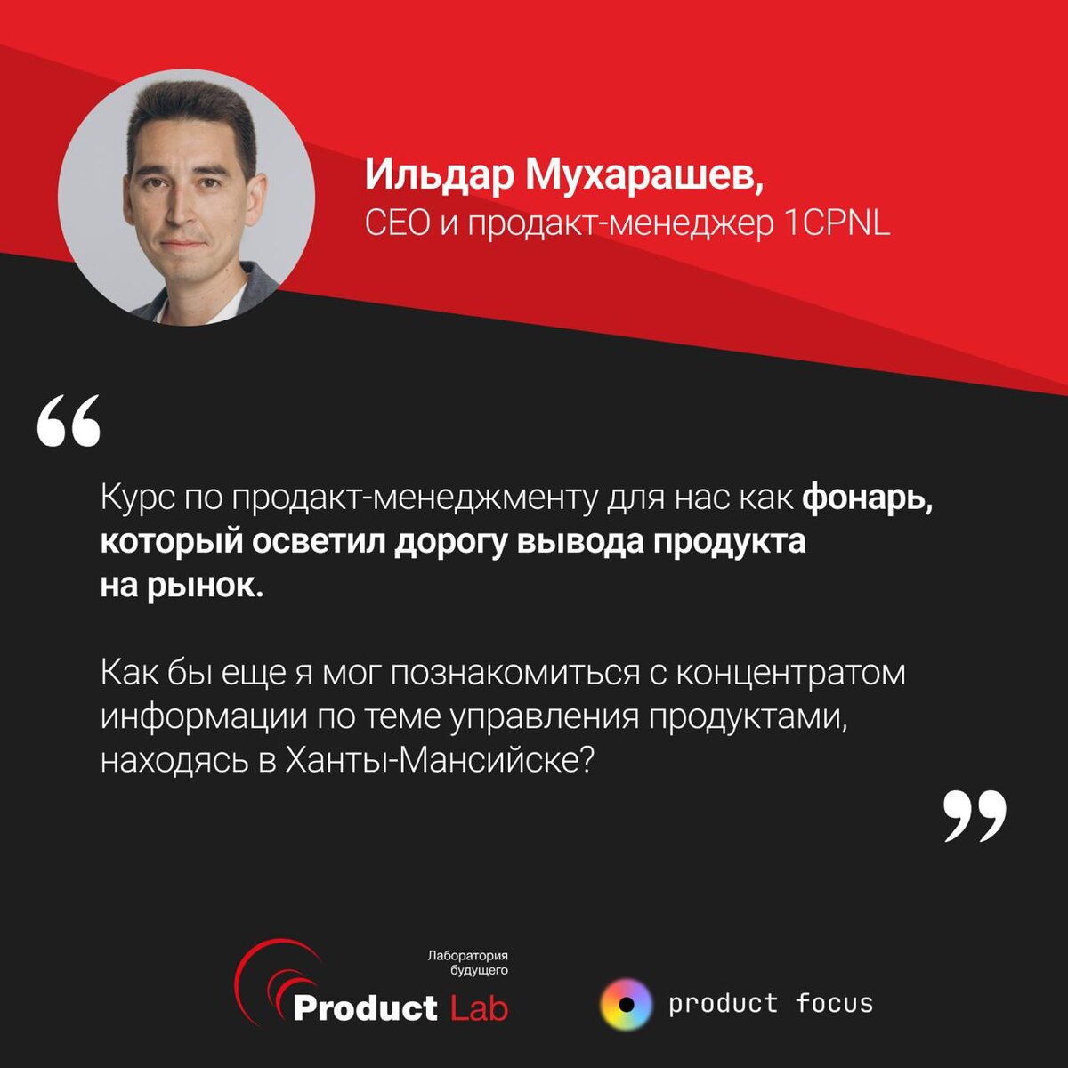 Пережить долину смерти, сделать сильный продукт и выйти на устойчивый рост: опыт выпускника Product Lab Друзья, привет! Делимся отзывом выпускника курса «Полное погружение в продакт-менеджмент» Ильдара Мухарашева, СЕО и продакт-менеджера 1СPNL — продукта для автоматизации финансового учета в 1С без таблиц. Вот, что Ильдар рассказал нам про опыт прохождения курса: За полтора года мы с продуктом прошли долину смерти и вышли в положительные показатели по операционной прибыли. Выручка прошлого года 1,5 млн. рублей, в этом году ожидаем 15 млн. В планах на следующий год продолжить активное масштабирование. Курс по продакт-менеджменту для нас как фонарь, который осветил дорогу вывода продукта на рынок. Как бы еще я мог познакомиться с концентратом информации по теме управления продуктами, находясь в Ханты-Мансийске? Курс оказался максимально целевым для меня и моей команды. Мы всегда следим за развитием продуктов выпускников и радуемся их результатам — такие истории дают нам мотивацию раз