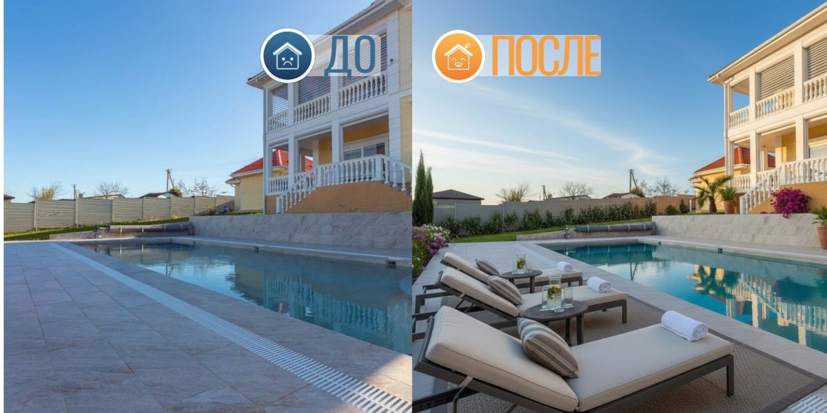 Home Staging у бассейна: роскошь без тысяч на мебель? 🏡✨ Привет, друзья! Представьте: у вас шикарный приусадебный участок с бассейном — мечта лета! Но на фото? Пустые лежаки вразнобой, тени от забора, солнце бьёт в глаза, а фасад дома выглядит уныло. Покупатель думает: "Красиво, но как жить?" Чтобы "оживить" пространство, можно "набежать" камерой на мебель: шезлонги, зонты, подушки — от 50 тысяч рублей, плюс время на доставку, расстановку и уборку. А если нанять профи-home stager? От 100 тысяч за проект + аренда оборудования. Итог: стресс, траты, а объект всё равно висит без просмотров. Знакомая "боль"? 😩 Но вот моя магия: виртуальный home staging для идеальных фото! Я покажу, как расставить всё профессионально — пледы и цветы для релакса, барбекю-зона с видом на сад. Всё реалистично, но без покупок: просто визуализация, чтобы покупатель увидел не пустоту, а свой отпуск в раю. А чтобы фото зацепило, я подкорректирую свет — золотой час заката, солнце мягко подсвечивает бассейн и фа