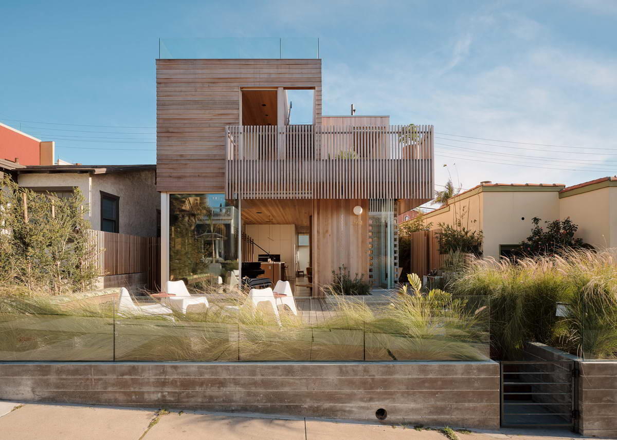 Этот эффектный прямоугольный дом из кедра построен для профессионального фотографа, его жены и их сына, увлеченного серфера. Объём состоит из серии сложенных блоков, покрытых планками из западного красного кедра, которые фрезерованы различными способами, чтобы придать контраст и текстуру. При проектировании Walk-Street House студия Ras-A стремилась создать максимальную жилую площадь и гараж на две машины — две важные просьбы домовладельцев — при соблюдении требований зонирования города. Одной из главных проблем проекта было ограничение участка размером 9 на 21 метр, который выходит с одного конца на пешеходную улицу, а с другого — на узкий переулок. Масштабируемый двухэтажный из кедра дом занимает почти всю территорию участка. Клиенты хотели иметь открытую концепцию на первом этаже, но зонирование требует большого гаража на две машины, который в противном случае заставил бы разделить жилые пространства небольшой площади на несколько уровней. Чтобы удовлетворить запросы клиентов, Ras-