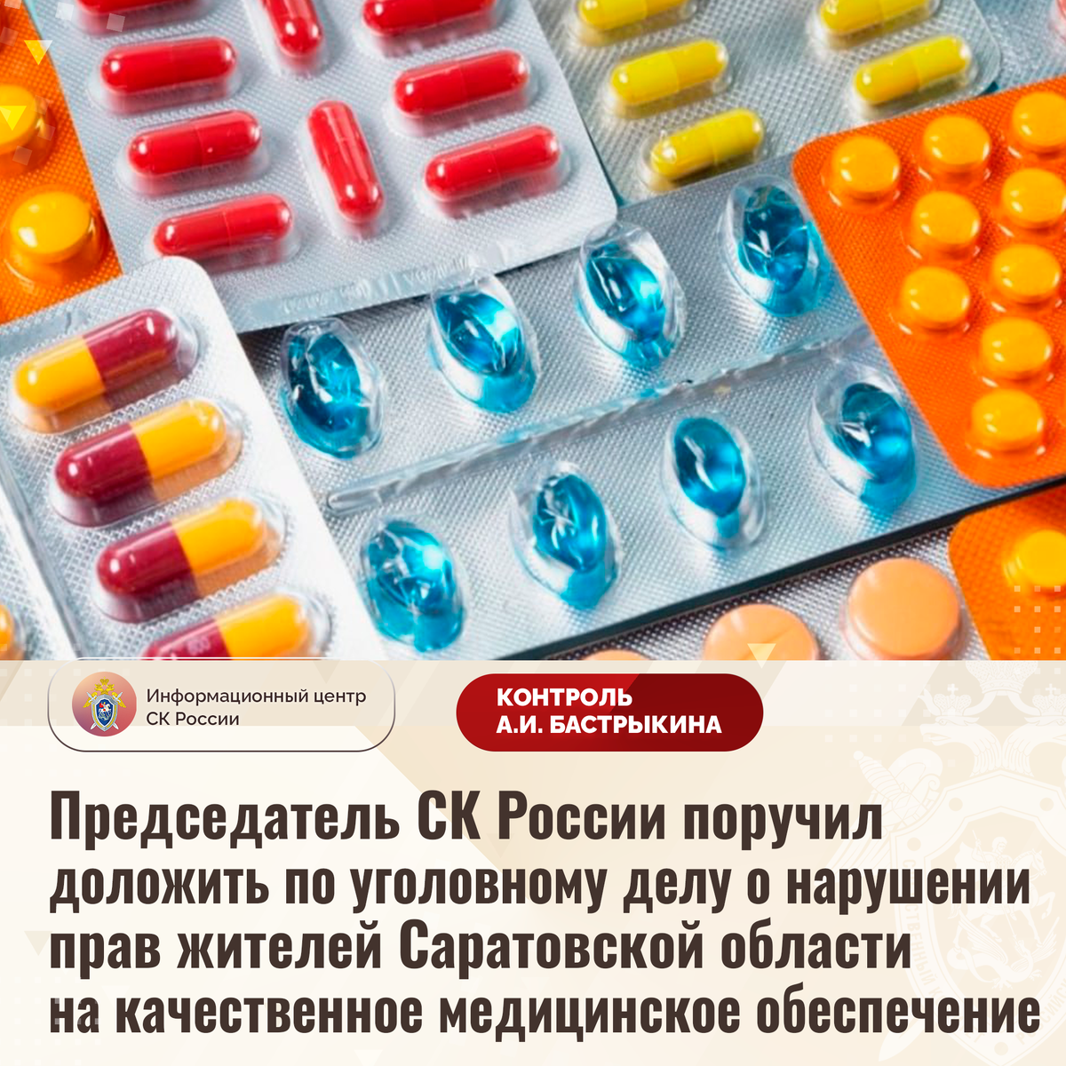 Председатель СК России поручил доложить по уголовному делу о нарушении прав жителей Саратовской области на качественное медицинское обеспечение В телеграм-канале сообщается, что в Саратовской области на протяжении длительного времени в больницах отсутствует медицинский препарат, необходимый для лечения лиц, страдающих тяжелым заболеванием. Нехватка медикамента приводит к прерыванию курса лечения, что ставит под угрозу жизнь пациентов. В СУ СК России по Саратовской области возбуждено уголовное дело. Председатель Следственного комитета Российской Федерации Александр Иванович Бастрыкин поручил руководителю СУ СК России по Саратовской области Дмитрию Александровичу Костину доложить о предварительных и окончательных результатах расследования уголовного дела. Исполнение поручения поставлено на контроль в центральном аппарате ведомства. #СледственныйКомитет #СКРоссии #СКР #ИЦСКР #ИнформационныйЦентр #АлександрБастрыкин #ПредседательСКР #КонтрольПредседателяСКР #КомментарийКонтроль #Саратовска
