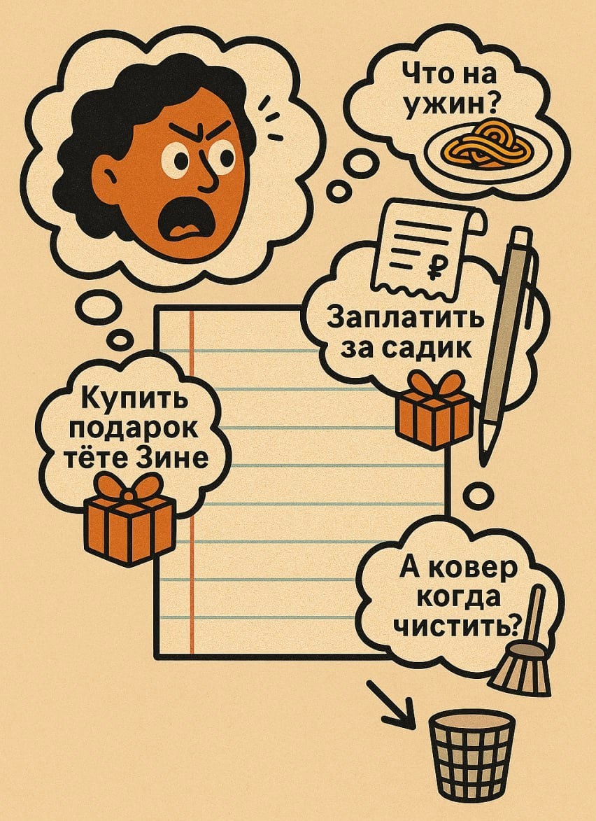 Паника по расписанию! И сегодня она выпала на СУББОТУ! 🗓🚨💥 Знакомо чувство, когда дел столько, что голова идёт кругом 🤯, а в итоге... не делаешь просто НИЧЕГО и винишь себя все выходные? 🙈💫 Стоп! 🛑 Сегодня тот самый день, чтобы разорвать этот порочный круг! 💢 Пора подходить к вопросу СИСТЕМНО! 🧨✨ Ваш план на сегодня — выдохнуть и освободить голову: ✨📝 Выгрузка мозга на выходные 🤯💬🗯 Тот самый внутренний диалог, который не дает расслабиться: «Что на ужин? 🍝» «Заплатить за садик 🧾» «Купить подарок тёте Зине 🎁» «А ковер когда чистить? 🧹» Просто берёте и выгружаете ВСЁ это из головы на листок! 📝➡️🗑 Никаких действий, просто треш-ток для вашего мозга. Позвольте себе отдохнуть, побыть с семьей! 🎤🧠
