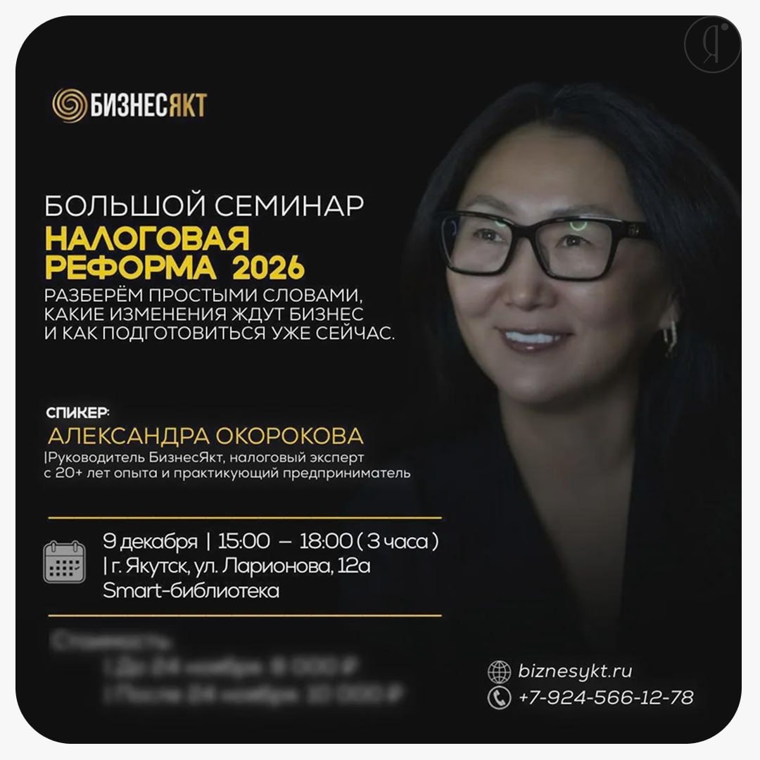 Семинар «Налоговая реформа 2026» #ВГороде #МК Спикер: Александра Окорокова – руководитель БизнесЯкт, налоговый эксперт с 20‑летним опытом, практикующий предприниматель. Программа: 15:00–17:00 — теоретическая часть: - обзор ключевых изменений налогового законодательства, вступающих в силу в 2026 году. 17:00–18:00 — практическая и консультационная сессия: - индивидуальные консультации со специалистами БизнесЯкт; - работа с таблицами и калькуляторами для расчёта оптимальной системы налогообложения и ставки НДС; - открытые консультации с Александрой Окороковой. 9 декабря | 15:00-18:00 Smart-библиотека, Ларионова, 12а 8000 руб. Справки по номеру: +7 (924) 566‑12‑78 biznesykt.ru Online Якутия | Ждем вас в МАХ