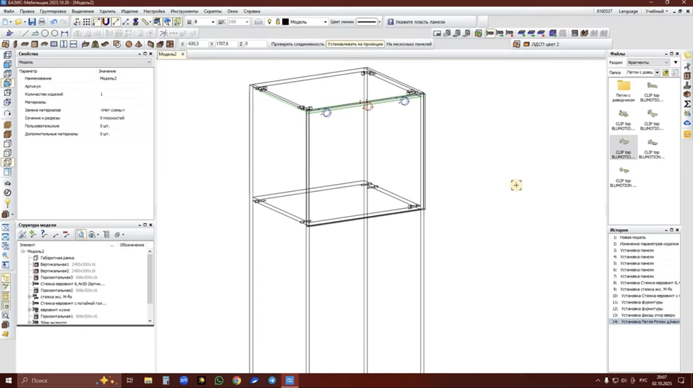 Привет, друзья! 👋 Сегодня разберём три способа установки фурнитуры в программе Базис-Мебельщик. Если вы только начинаете работать с этой программой, то обязательно прочитайте до конца -разберём всё: от простейших евровинтов до автоматических схем крепежа, которые экономят часы работы. 1. Параметрическая фурнитура Начнём с самого простого и базового способа - параметрическая фурнитура. Это вариант, где нет тела, только отверстия. Например, петля в параметрическом виде - это просто её отверстия без визуальной геометрии. Такой метод удобен, когда нужно быстро задать присадку, но внешний вид фурнитуры не играет роли - например, для чертежей или передачи на ЧПУ. Пример: Берём петлю Blum, выбираем тип «накладная», ставим отверстие -и всё. В документации она уже отобразится корректно, даже без модели. 2. Произвольная фурнитура Второй вариант — произвольная установка фурнитуры. Здесь уже есть тело детали, а значит, мы видим сам элемент в модели. Это может быть: ● эксцентрик, ● шток, ● еврови