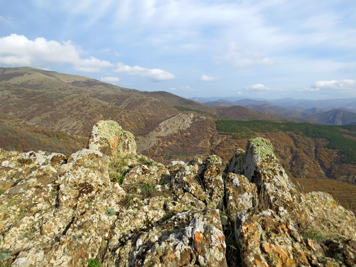 Была мысль пройти еще дальнюю вершинку со скалами, но, увидев прекрасное, закрытое от ветра место между скалками, решили остаться здесь на привал. Должна сказать, что в этот раз мне совсем не хотелось уходить. Вдали манил своим изрезанных скальным хребтом Таракташ. Обычно я не люблю длинные привалы. А здесь, найдя удобную трещинку в скальных выходах и уютно в ней устроившись, я могла сидеть и сидеть, смотреть и смотреть. Смотреть, как солнце бежит по склонам, оставляя за собой яркие пятна листвы. Как по небу медленно ползут облака, то цепляясь за горы, то повторяя абрис гор. Каким душевным местом оказалась эта небольшая полянка! И вечно это слово НАДО. И вечно оно не вовремя! Но, надо собираться и идти обратно. Пока, загадочные виды! Пока, наконец-то блеснувшее вдали море! Пока, Чертовы Рожки! Мы еще вернемся к вам с ночёвкой! И снова под ногами ветер треплет шелковые травы. На обочине испуганная цветущая яблонька. В конце ноября! Солнце передвинулось по небу