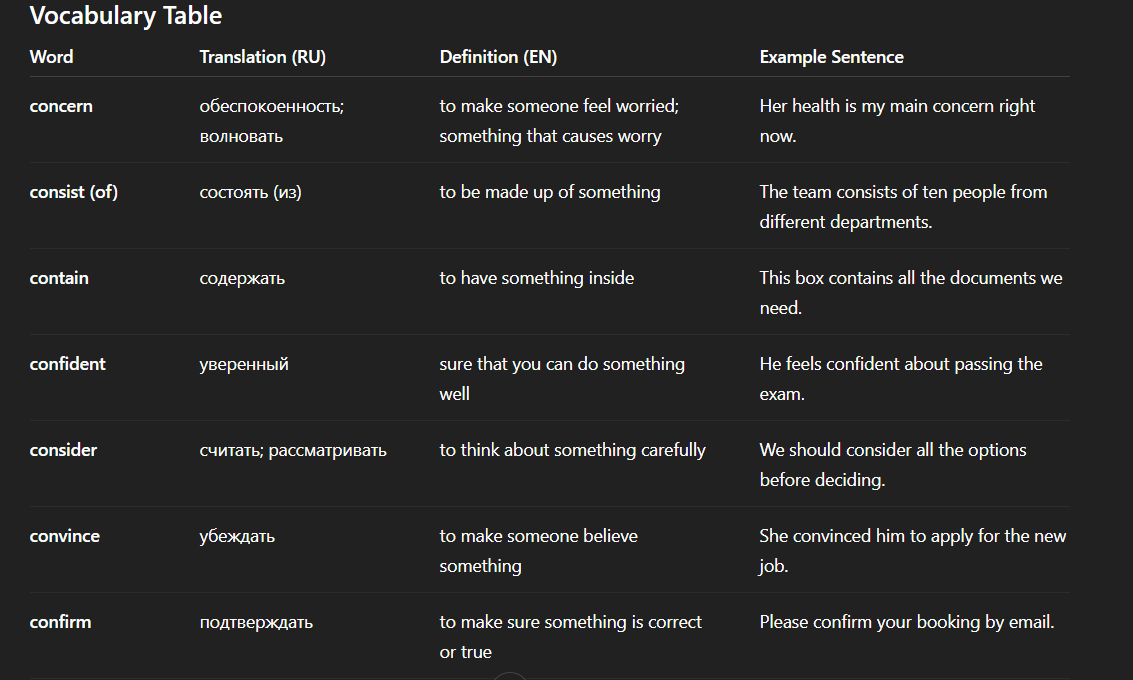 concern, consist, contain, confident, consider, convince, confirm, pretend, predict, succeed, admire, admit, appreciate, substitute, confess.