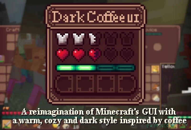 Dark Coffee GUI - менюшки в стиле черного кофе Устал от скучных и ярких менюшек? Смотри, как твой Майнкрафт превращается в стильный черный кофе! Полное преображение интерфейса. Тёмно-коричневые оттенки, новые иконки идеально для глаз и атмосферы. Никакого визуального мусора, только чистая эстетика для комфортной игры.