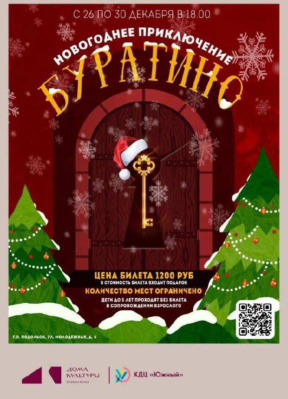 ✨ Новогодние приключения Буратино Что входит в стоимость билета? - Игровая программа перед началом спектакля - Увлекательное новогоднее шоу - Бумажная дискотека - Подарок ⭐️ Дети до 5 лет проходят в сопровождении взрослого! 🚫 Возраст: 0+ 📆 26.12.2025 🕒 18:00 🏢 КДЦ "Южный" 📍 г. Подольск, ул. Молодежная, 4 💰 Цена: 1200 ₽ 🎫 Купить билет: https://buratino-new-year.ticketscloud.org/ ⭐Поддержать канал голосом 🍰Где поесть в Подольске ✅ Мероприятия Подольск https://dzen.ru/id/66ed500f7b5671493eca3fd6 http://vk.com/podolsk_events http://dzen.ru/podolsk_events