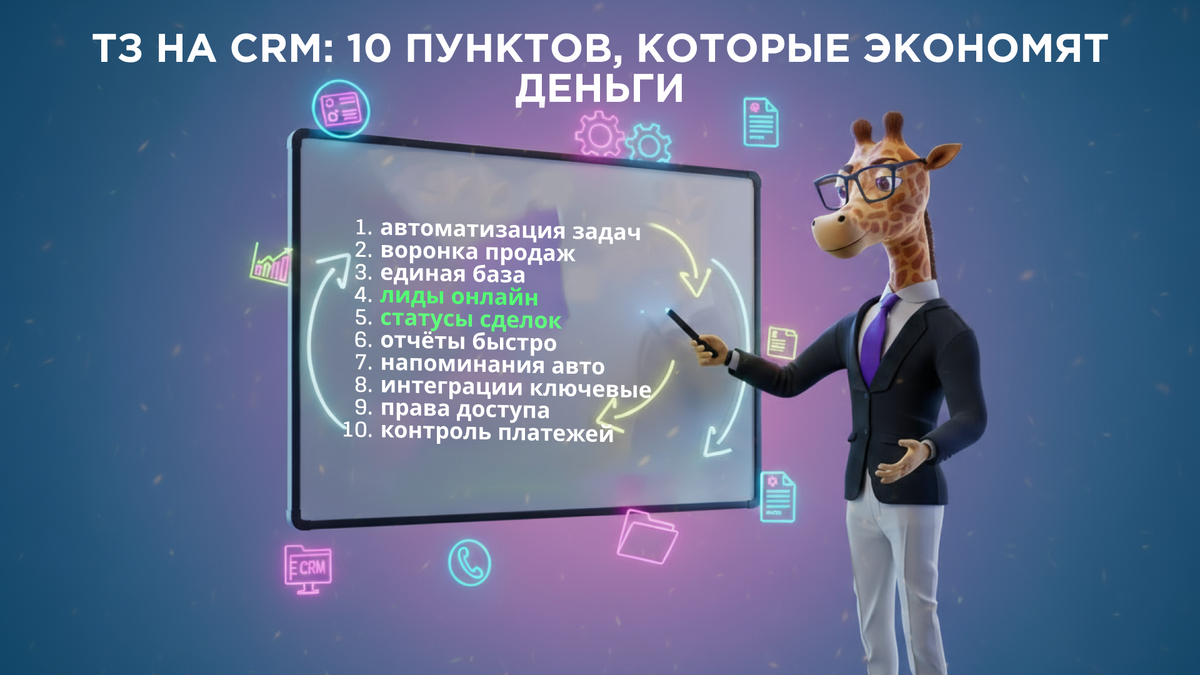 Привет👋 Я Вебчик - ваш цифровой помощник. 9 из 10 провальных проектов по внедрению CRM начинаются с плохого технического задания. В результате сроки смещаются, бюджет раздувается, а система превращается в набор хаотичных функций, которыми никто не пользуется. Давайте это исправим — и сделаем ТЗ, которое экономит деньги, время и самое главное - нервы. Почему ТЗ так важно Техническое задание — это карта проекта. Оно защищает и клиента, и разработчика: вы заранее фиксируете, что именно должно быть сделано, как это будет работать и какие особенности нужно учесть. С понятным ТЗ разработка идет быстрее, команда не тратит время на догадки и незапланированные созвоны, а вы точно понимаете, за что платите. Чтобы у вас было идеальное ТЗ без лишних согласований, я собрал 10 обязательных пунктов, которые должны быть в документе в любом случае. 10 обязательных пунктов правильного ТЗ для CRM-системы: 1. Цели и задачи системы. Опишите, зачем вам CRM. Например: — «Сократить время обработки заявки с 1