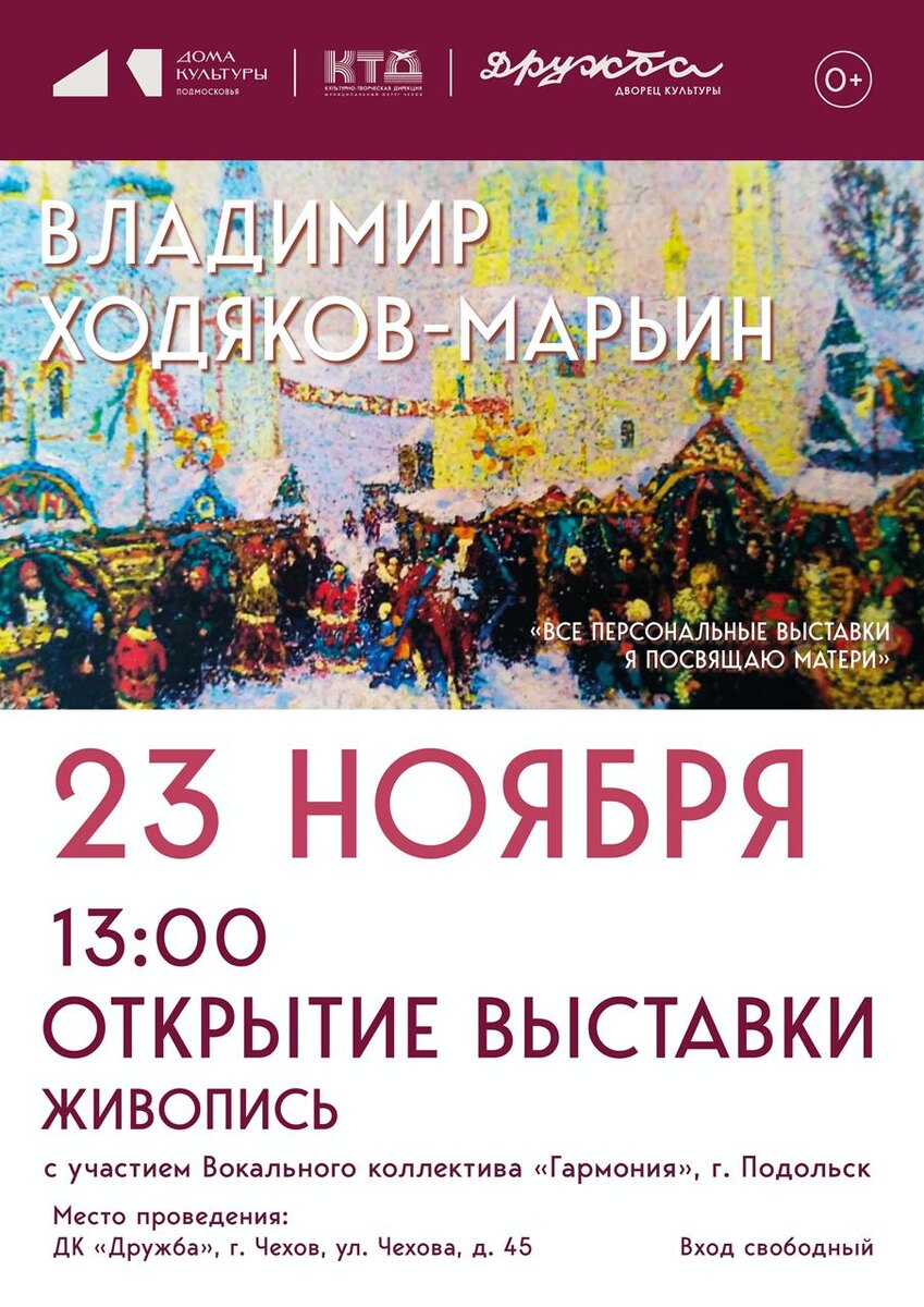 ✨ Приглашаем Вас на художественную выставку Владимира Ходякова-Марьина Свою выставку Владимир посвятил самому близкому и родному человеку на земле – своей матери. Она олицетворяет начало жизни, поддержку и вдохновение, является символом любви, заботы, терпения и мудрости. 🧑🎨Немного о художнике: Владимир Ходяков-Марьин – член Союза Художников РФ, живописец, педагог. Участник областных, республиканских, зональных, всесоюзных и зарубежных выставок. 👉Работы художника находятся в галереях и частных коллекциях Москвы, Подмосковья, Болгарии, Парижа, Токио и других городов мира. 🚫 Возраст: 0+ 📆 23.11.2025 🕛 13:00 🏢 ДК «Дружба» 📍 г. Чехов, ул. Чехова, д.45 🪙 Вход свободный❗️ ⭐Поддержать канал голосом ✅ Мероприятия Чехов https://dzen.ru/id/66cc4b48e9ef144699238a51 http://vk.com/chekhov_events http://dzen.ru/chekhov_events