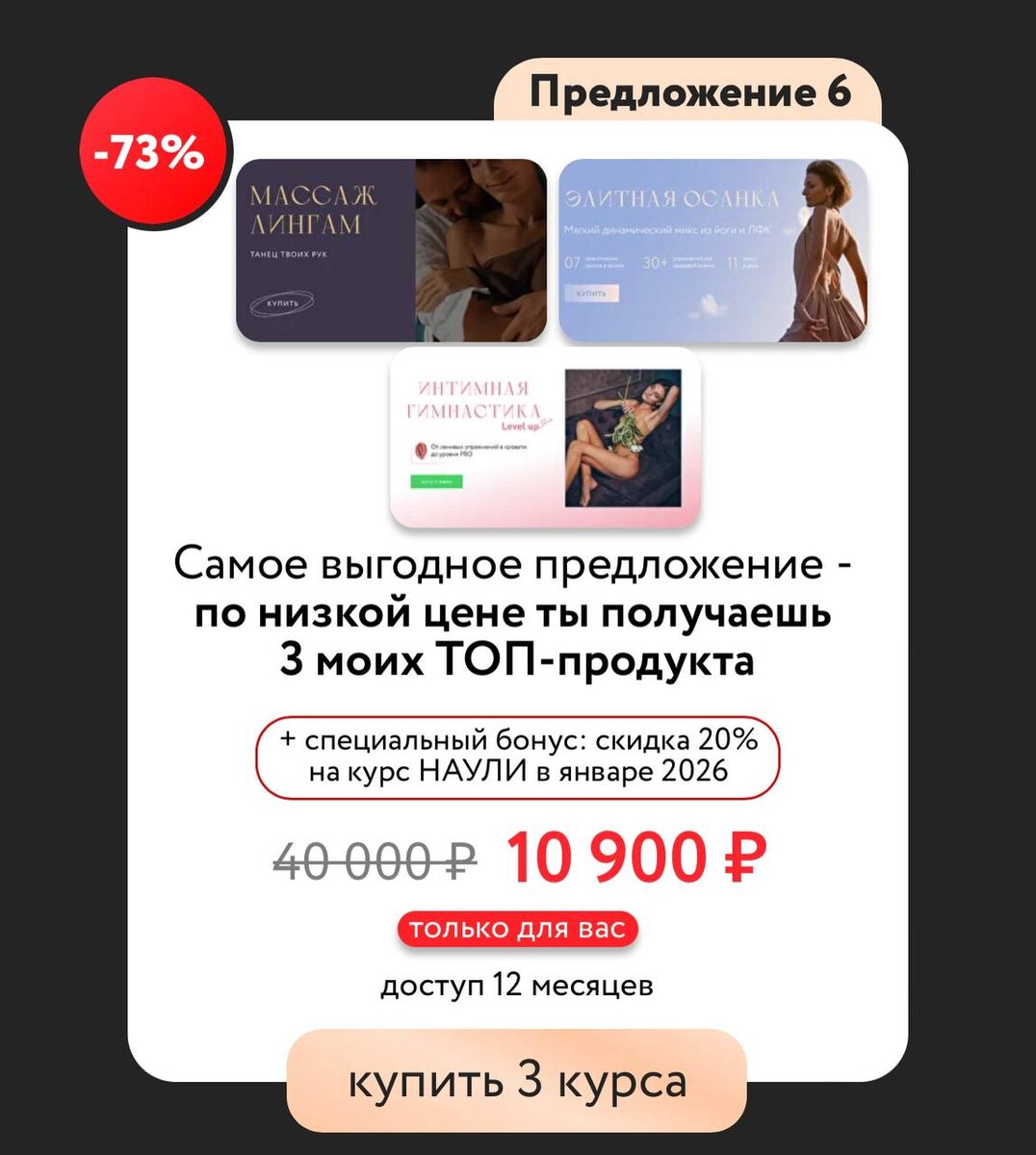 ‼️Все вместе ‼️ Тройное комбо Я приготовила для вас тариф, который включает в себя сразу три курса. Вместе они откроют новые горизонты знаний и ощущений, помогут вернуть страсть в отношения и заставят мужчину снова смотреть на тебя влюбленным взглядом. Что входит в это предложение ⬇️️ 🔥 «Массаж Лингама или Танец твоих рук»: курс, который разовьет чувственность и улучшит отношения с партнером. Твои руки станут волшебным инструментом, от которого мужчина будет трепетать. 🔥«Элитная осанка»: курс, который не только улучшает здоровье, но и делает тебя более привлекательной. За 11 минут в день ты освоишь техники, которые укрепят мышцы спины, подарят королевскую осанку и поднимут уверенность в себе. 🔥 «Интимная гимнастика уровень 1 и 2»: впервые в таком формате. Курс, который укрепляет интимные мышцы, повышает качество интимной жизни и укрепляет здоровье в целом. Научишься выполнять специальные упражнения, которые сделают ощущения более яркими, орGазмы более частыми, а возможности